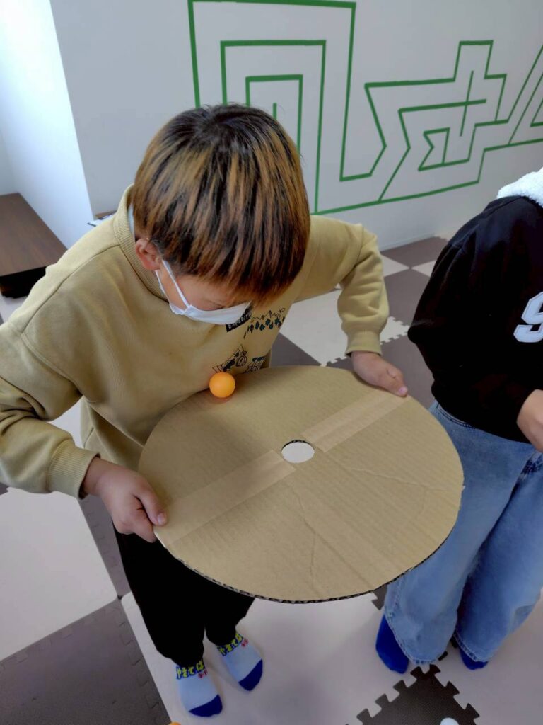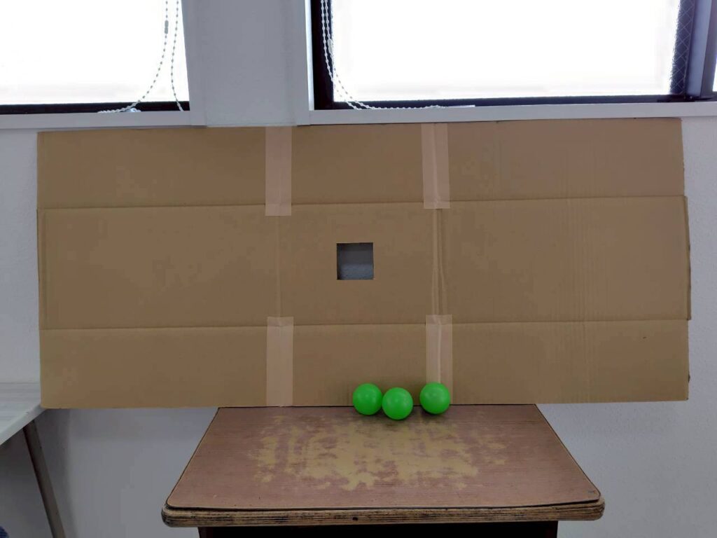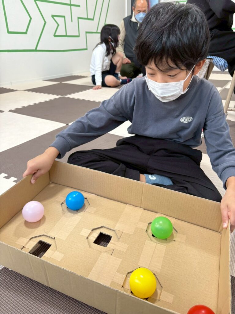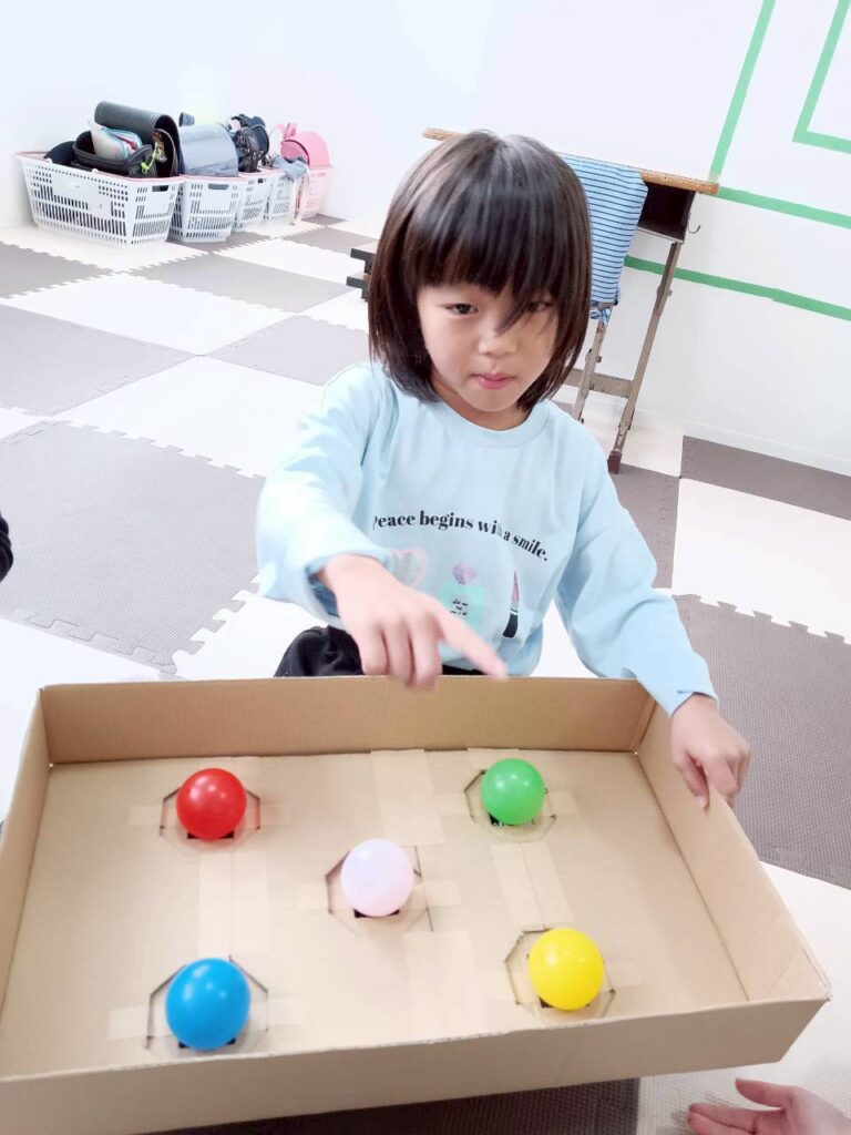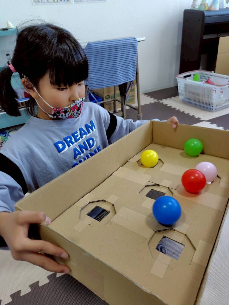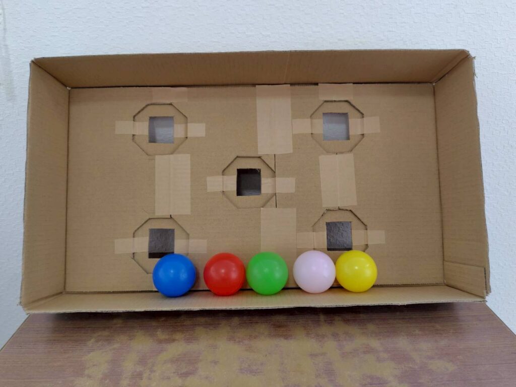 段ボール箱のバランスを取りながら、5色のボールを5つの穴にはめていきます。