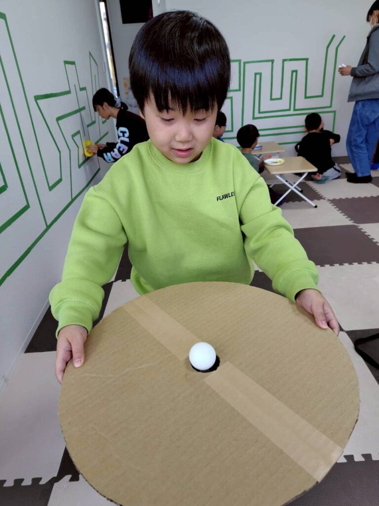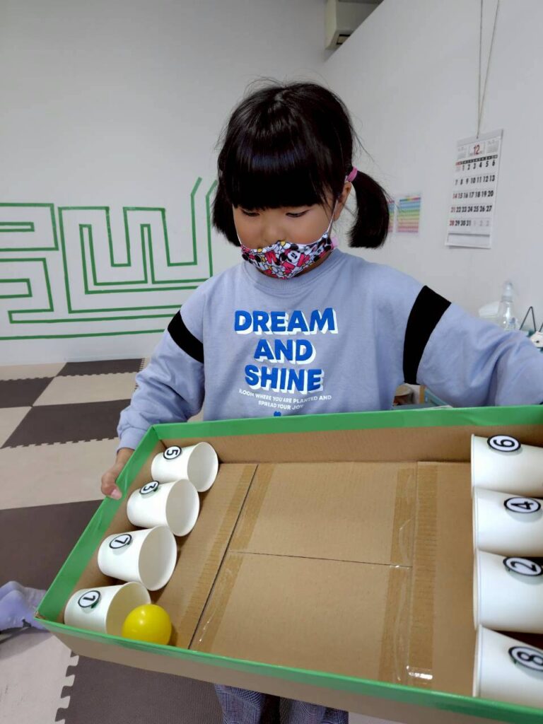 順番とは違う紙コップにボールが入り、何度もやり直しながら、