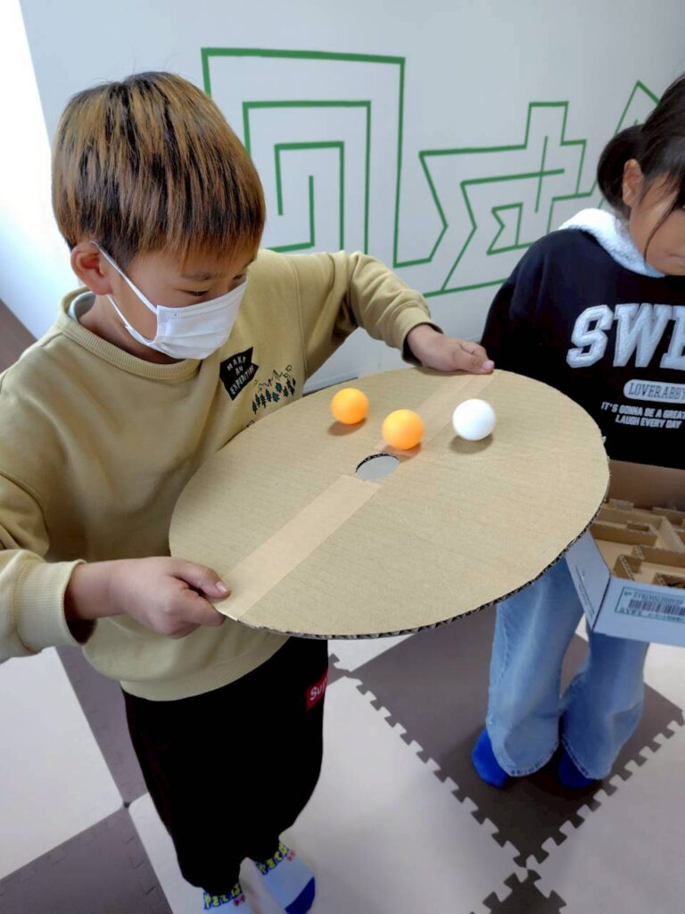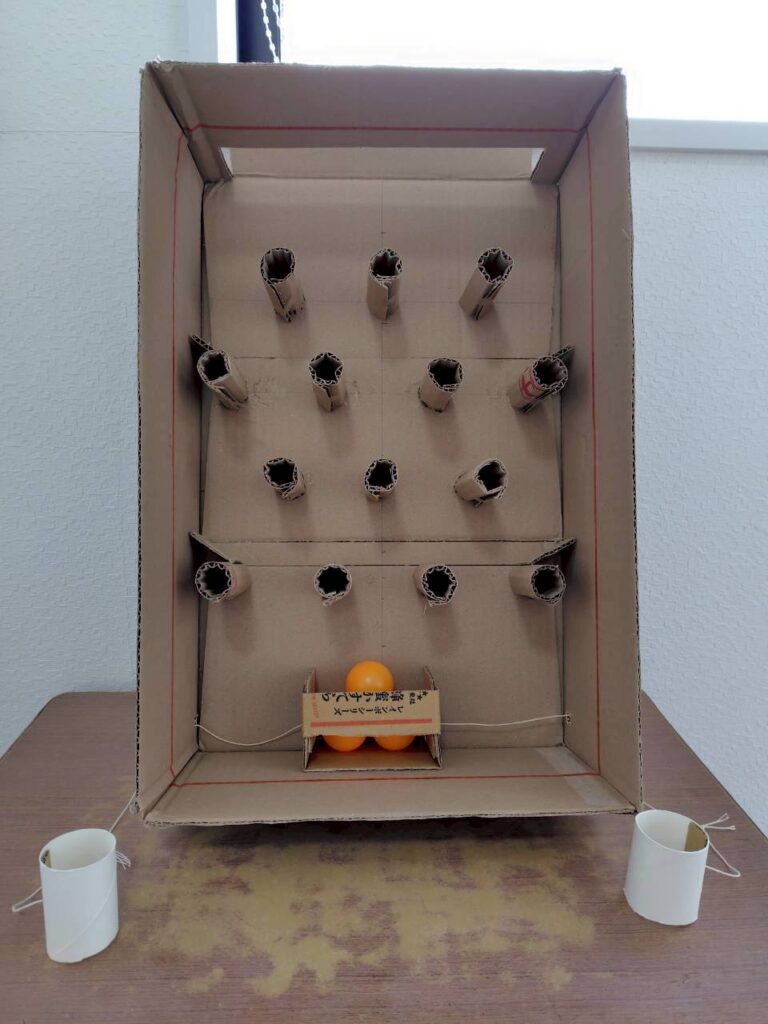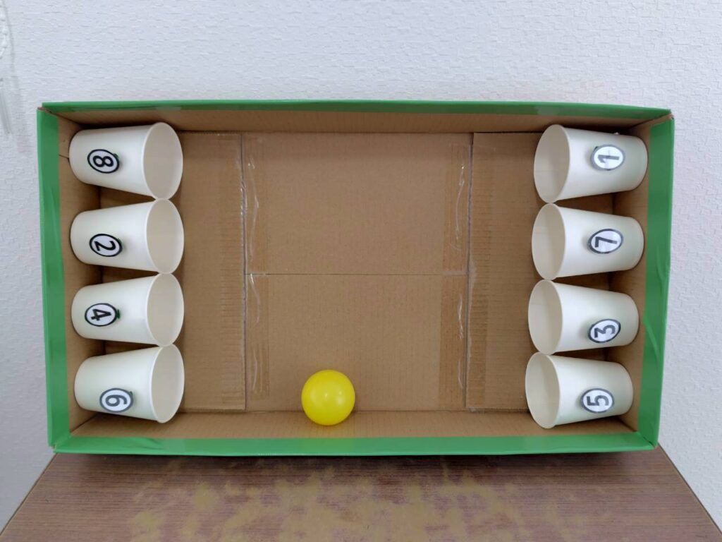 段ボール箱のバランスをとってボールを転がし、1から8の紙コップまで、
