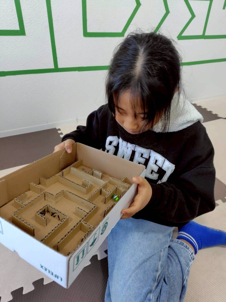 今回は、スタッフが段ボール箱を使って手作りしたおもちゃで遊ぶ子どもたちの様子をお届けします。