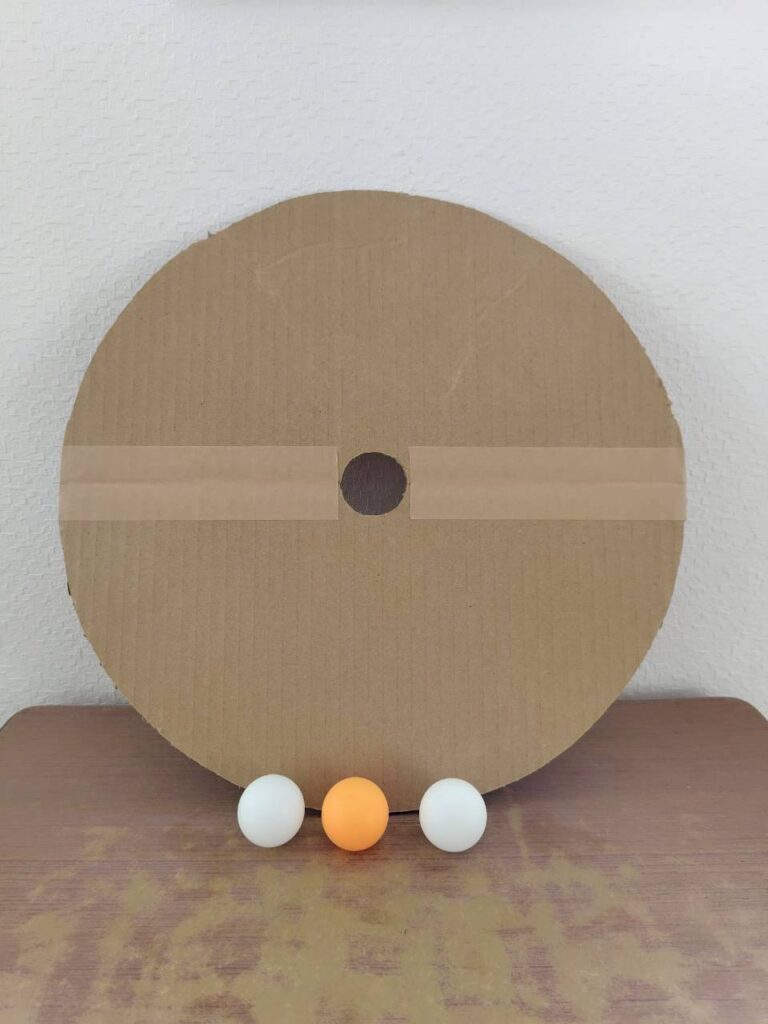 大き目のボードの両端を2人で持って、バランスを取りながら真ん中の穴にボールを落とします。