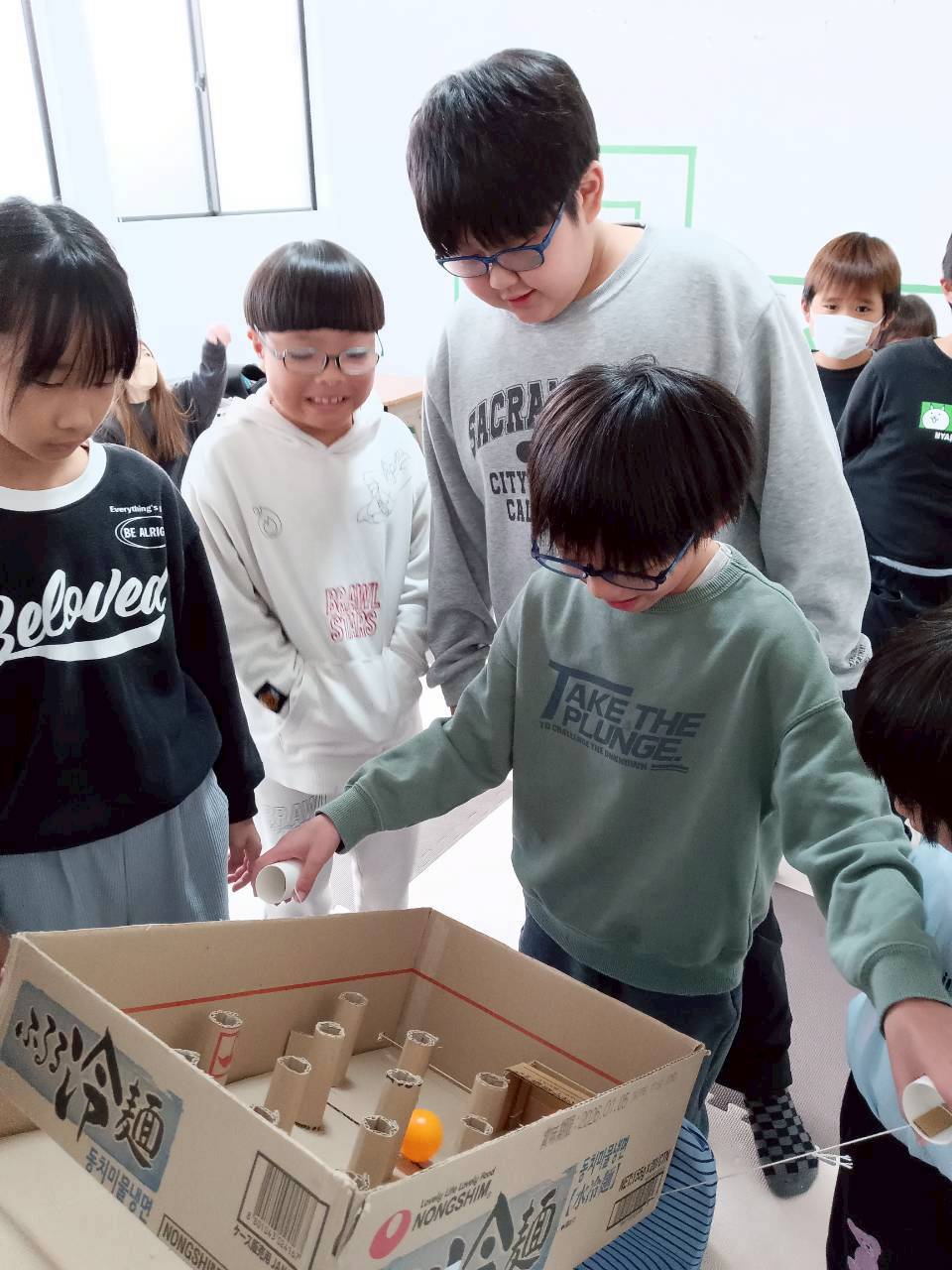 段ボール箱のバランスをとってボールを転がし、1から8の紙コップまで、