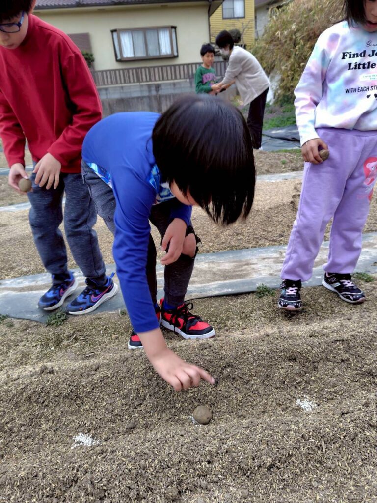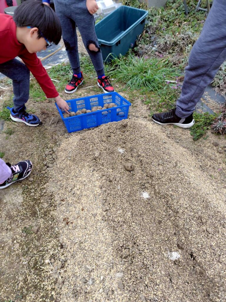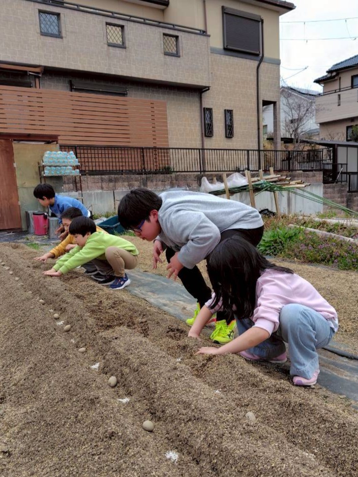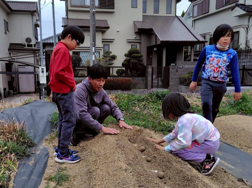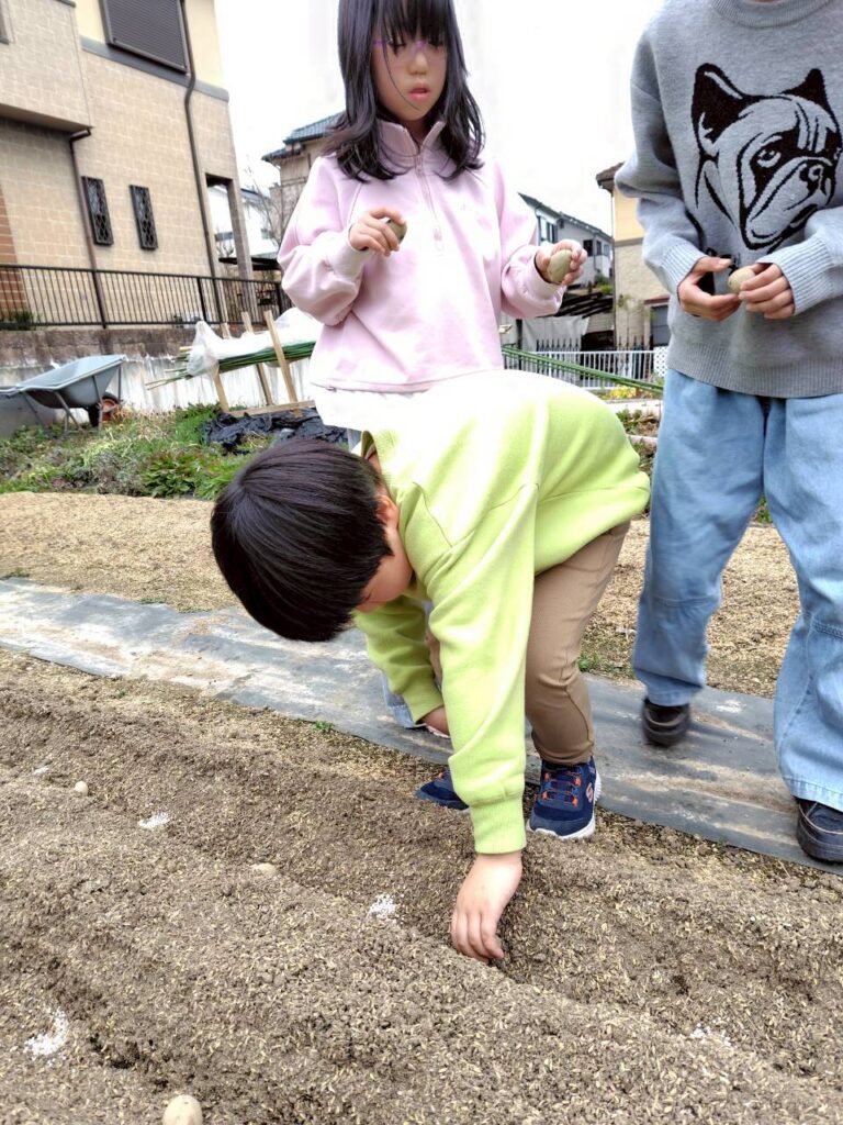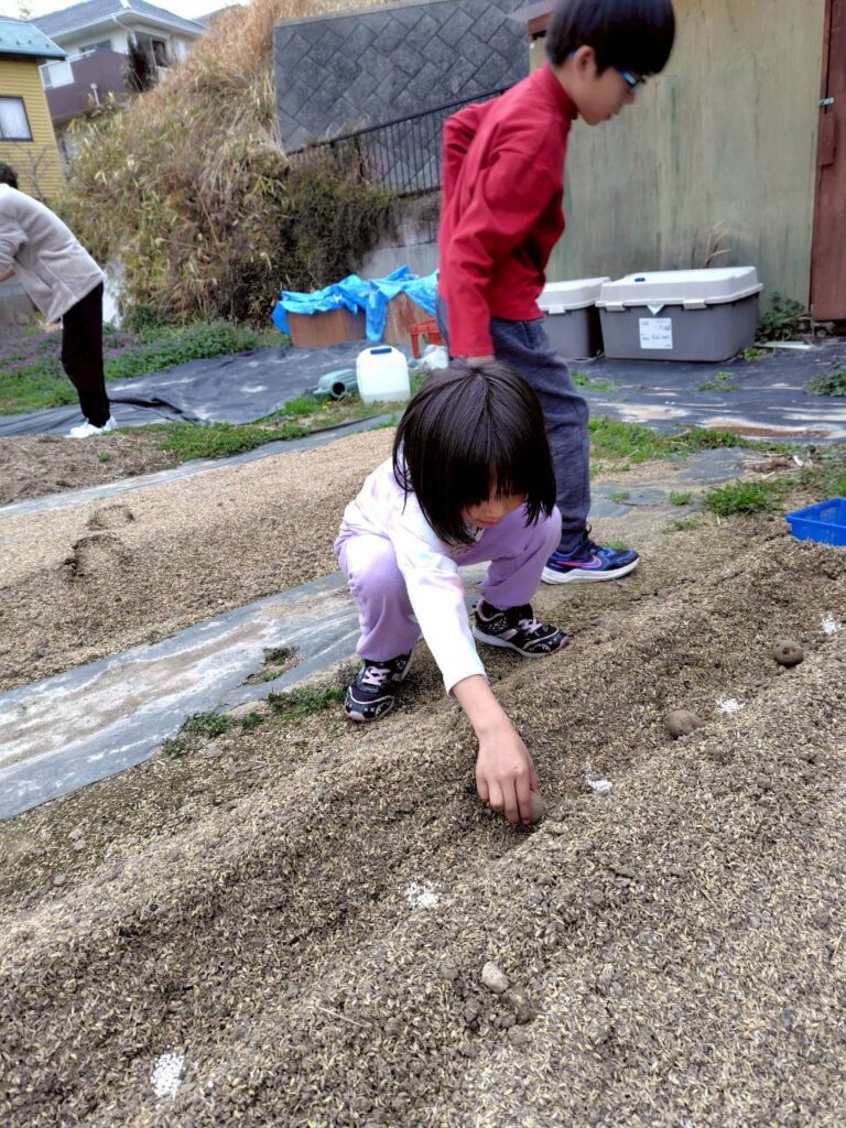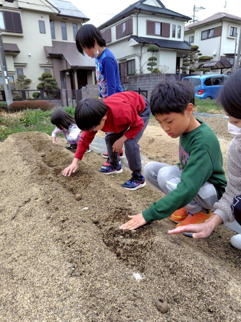 並べた種芋に、みんなでやさしく土をかけていきましょう。