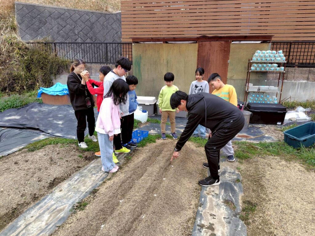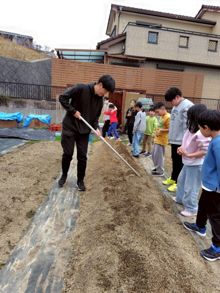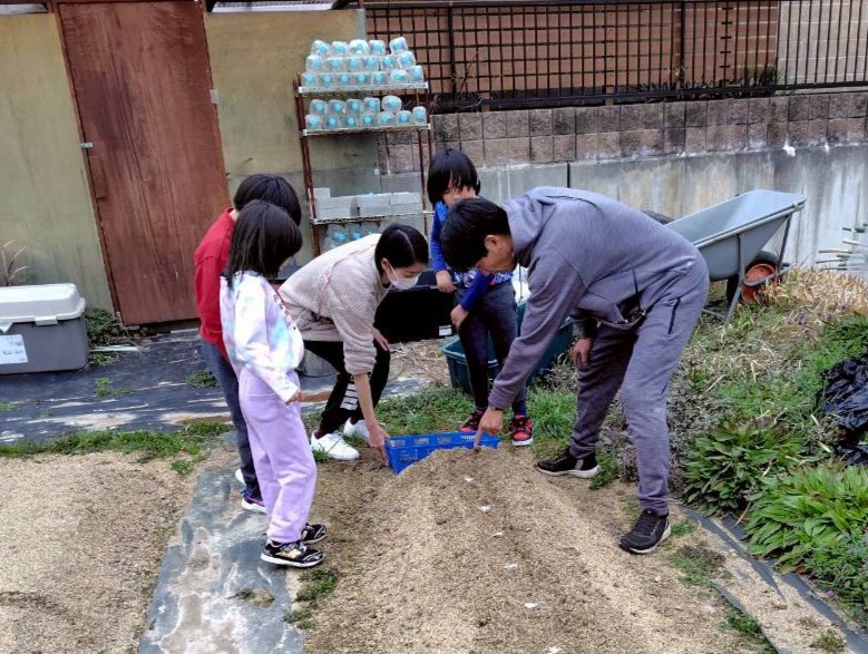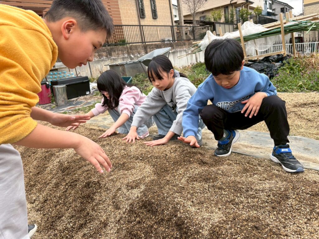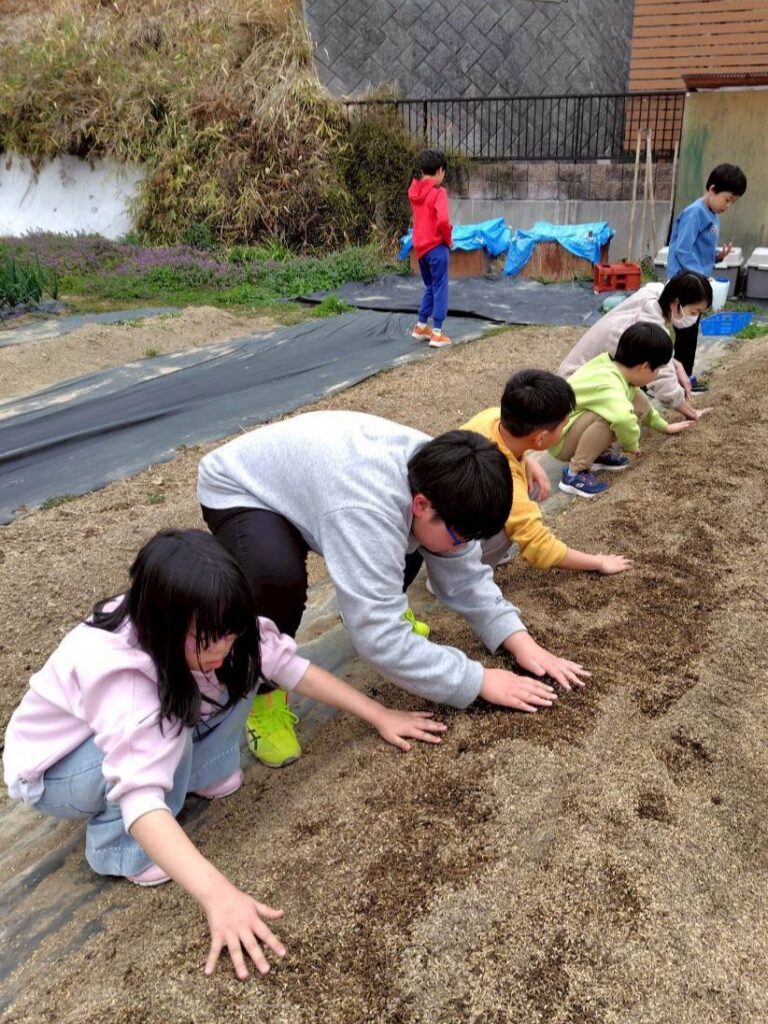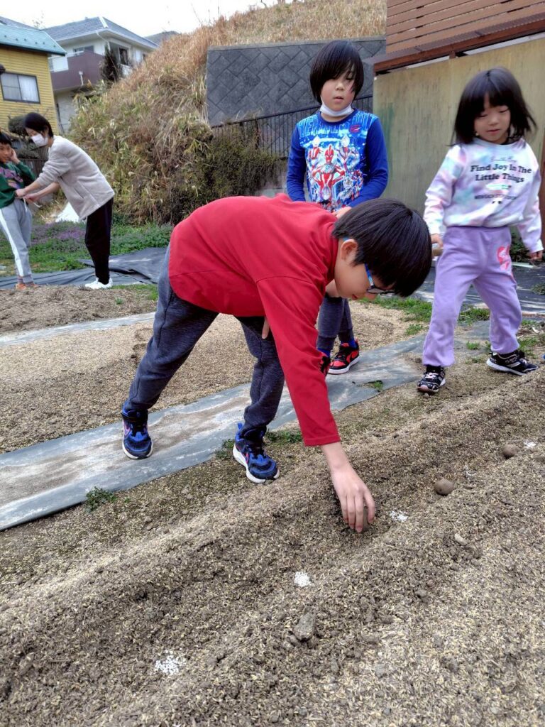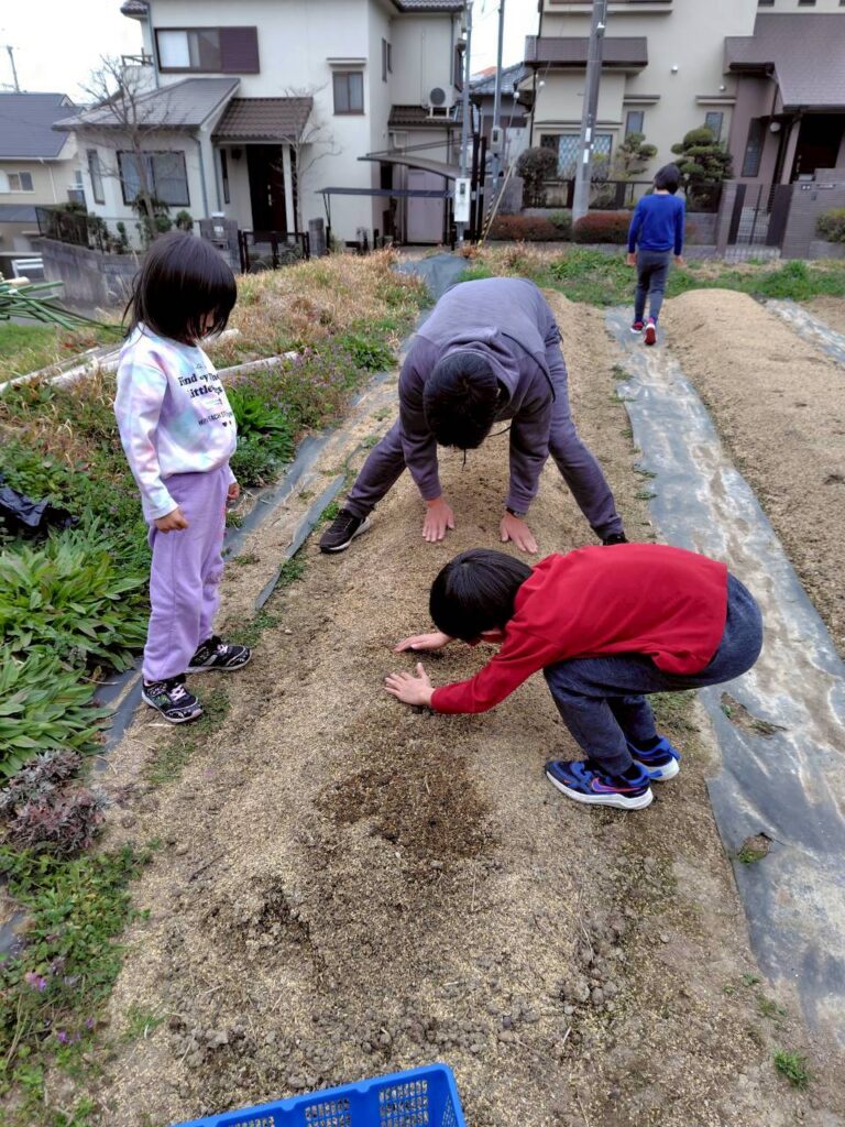 並べた種芋に、みんなでやさしく土をかけていきましょう。