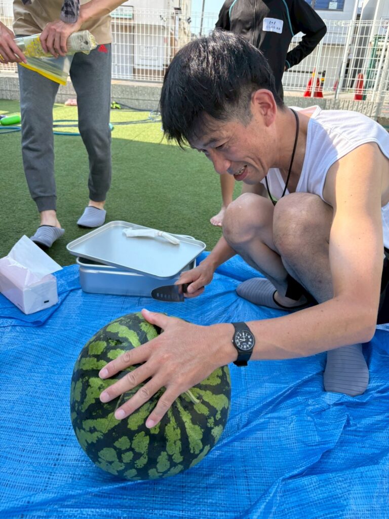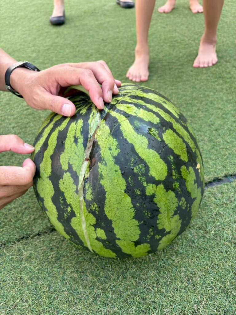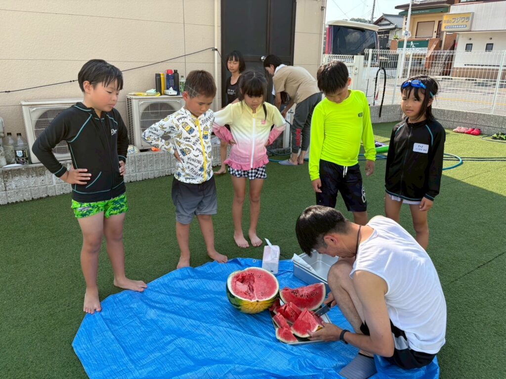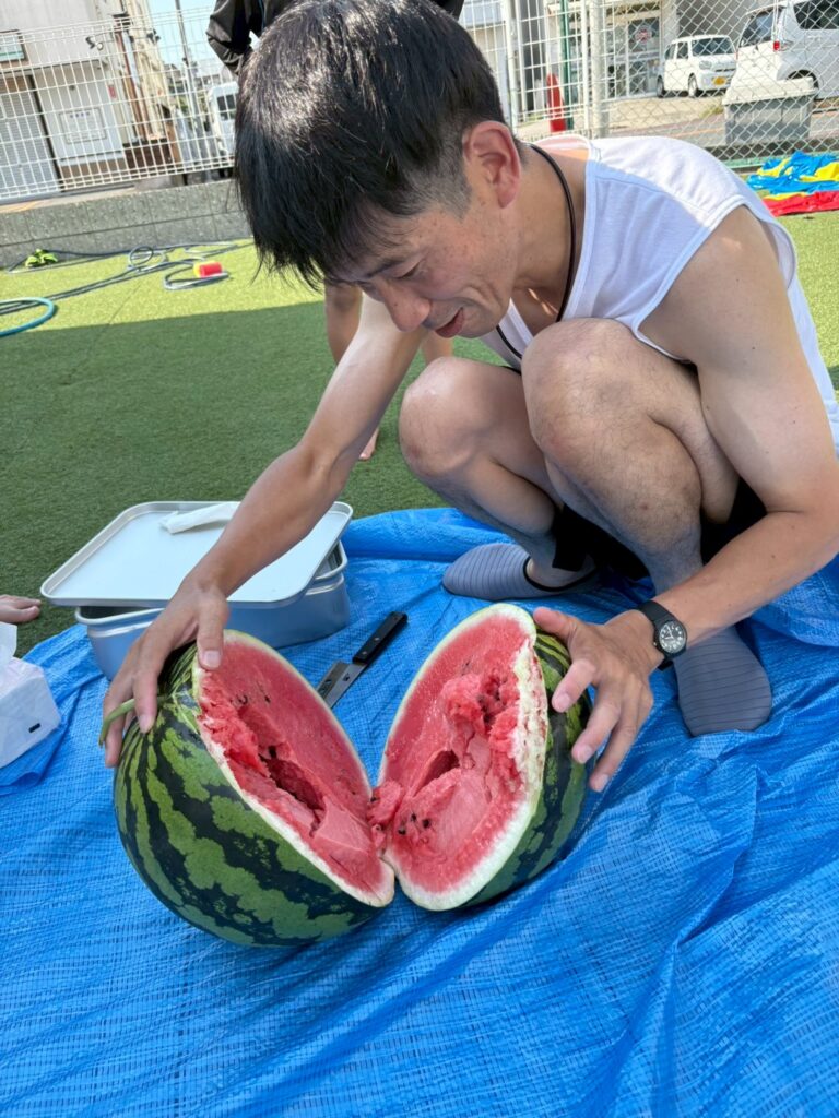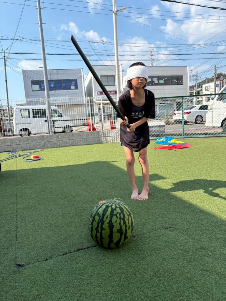 子どもたちのかけ声のおかげで、スタッフが木刀で見事一発でスイカにミートさせることができました✨