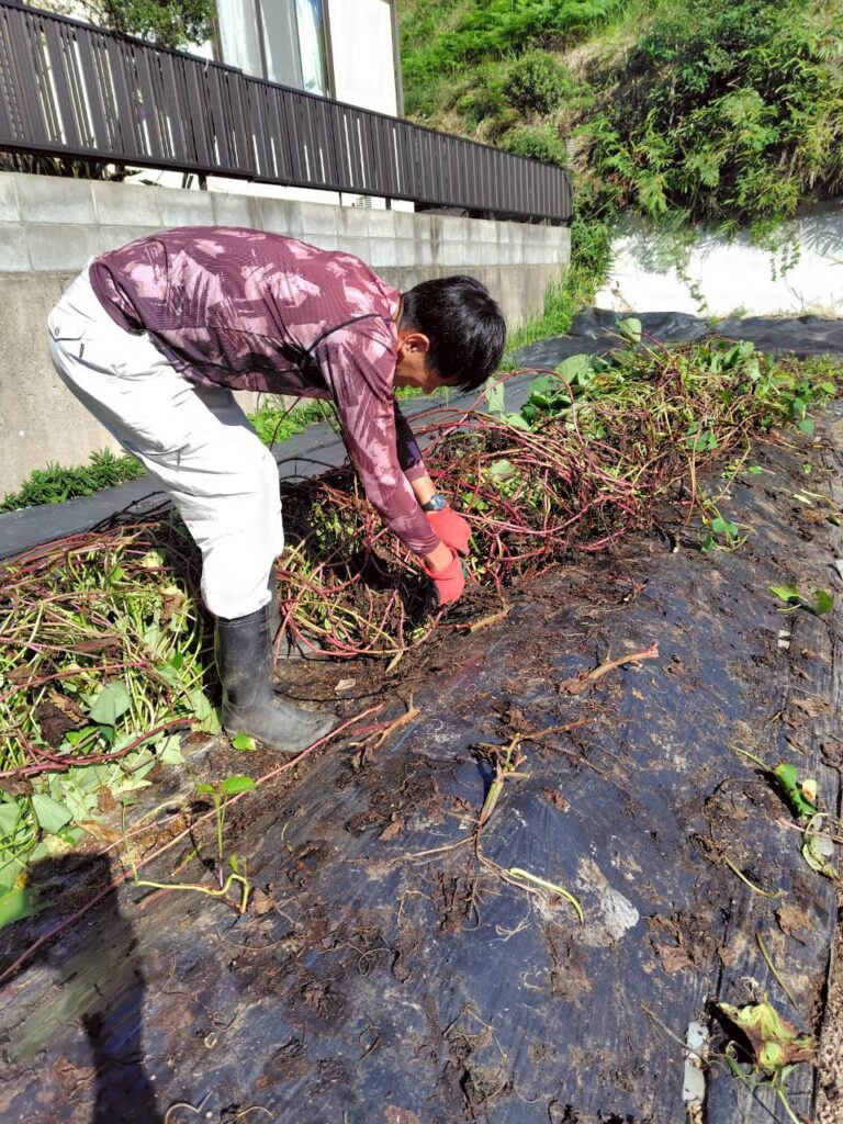 朝から施設長が、芋ほりの準備のためにサツマイモのつるを切ってくれています。